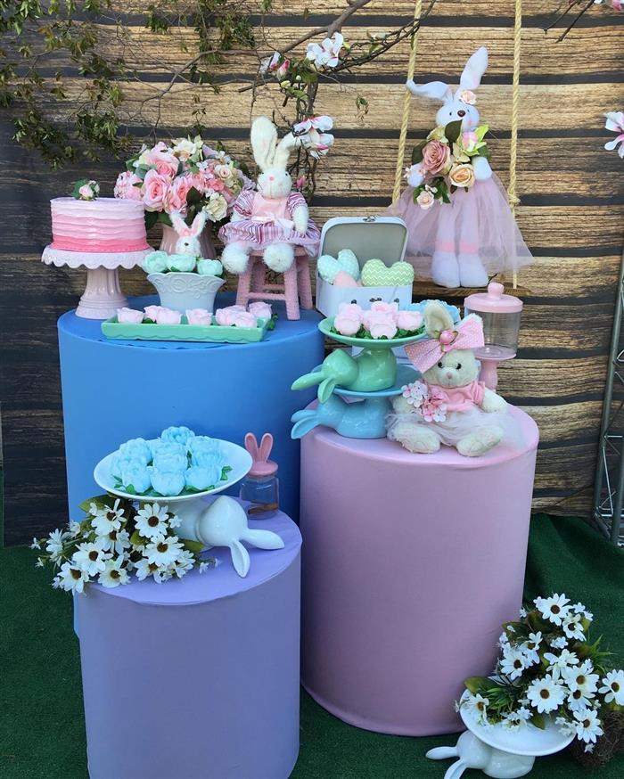 Você poderá apostar em muitos coelhinhos e ovos coloridos, o legal desse tema é que você pode brincar com bichinhos de pelúcia e também criar muitas decorações simples com bastante criatividade.