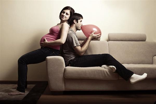 O pai do bebê também pode aparecer brincando com seu barrigão. Inclua elementos como roupinhas e sapatinhos já comprados para o bebê.