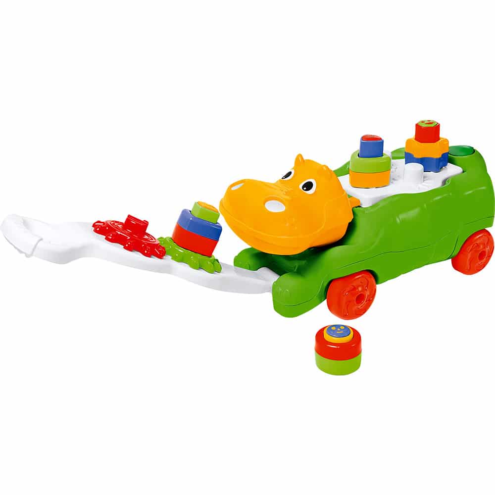 • Amiguinho da Selva Hipo Calesita Verde e Amarelo: o Hipo vem com engrenagens giratórias, blocos didáticos super coloridos que levantam quando são encaixados. O brinquedo também abre a boca e os dentes, que são blocos. A tampa abre para encaixar e guardar os blocos. O brinquedo ainda vem com puxador para o bebê levar seu amiguinho para passear. Quando a brincadeira acabar, o puxador dobra para guardar. Na loja online Shoptime, o valor é R$ 134,91.