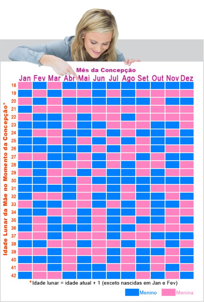 Tendo em mãos a idade lunar e o mês da concepção, basta cruzar as informações na tabela: se der quadradinho azul o bebê será menino, se der rosa será uma menina.